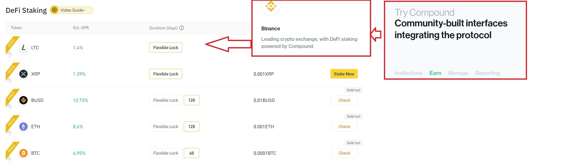 Инструменты Compound Finance интегрированы во многие популярные на рынке цифровых активов платформы. Например, зарабатывать на блокировке активов в децентрализованном протоколе можно через криптобиржу Binance. Список платформ, через которые можно организовать DeFi-стейкинг на базе инструментов протокола, доступен на главной странице его официального сайта в разделе «Community-built interfaces integrating the protocol».
