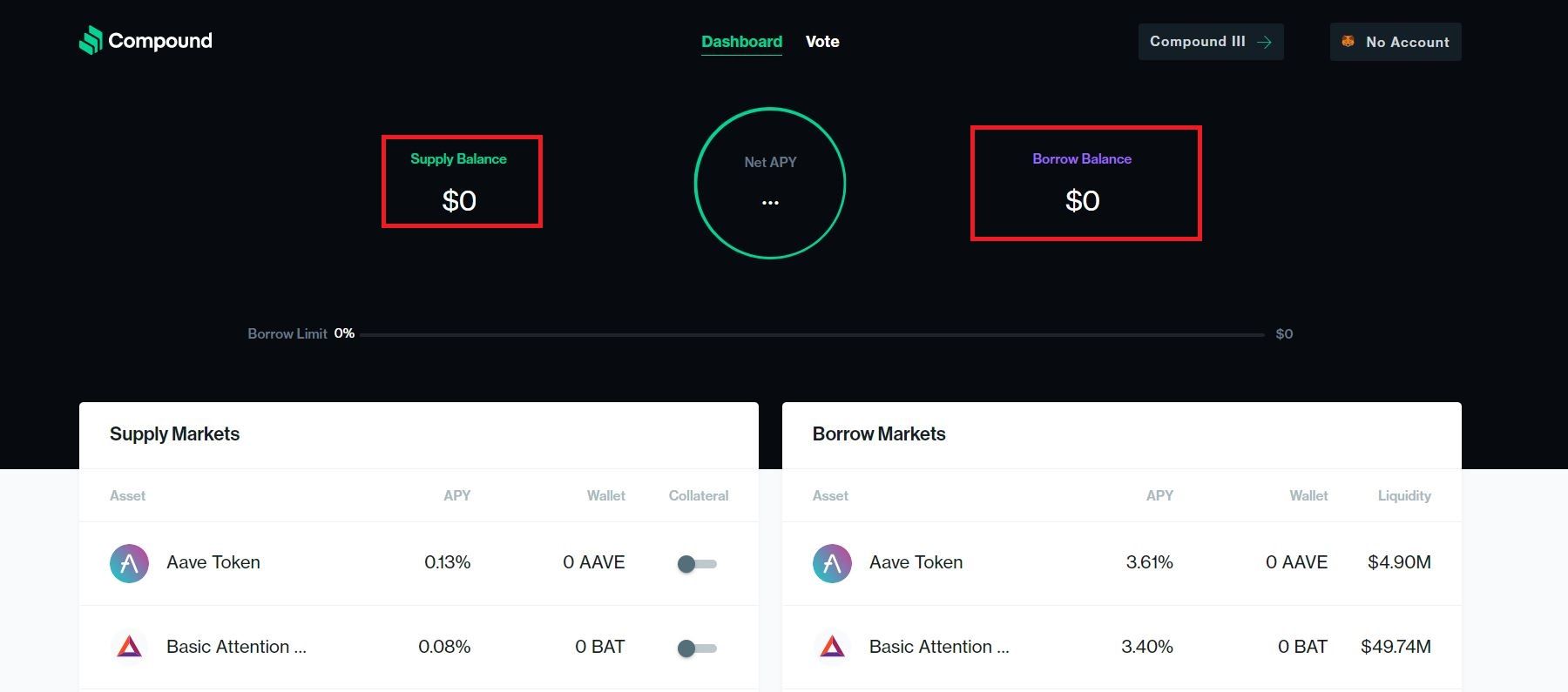 Через подключение при помощи криптокошелька пользователь получает доступ к функциям децентрализованного протокола. На его главной странице система выводит объем заблокированных юзером средств под нужды Compound и количество активов, которые он взял взаймы.