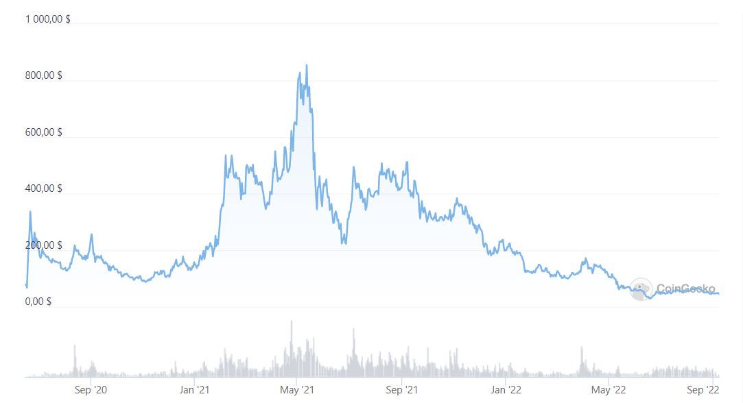 По состоянию на момент написания обзора криптовалюта торгуется на 95% ниже максимума 2021 года.