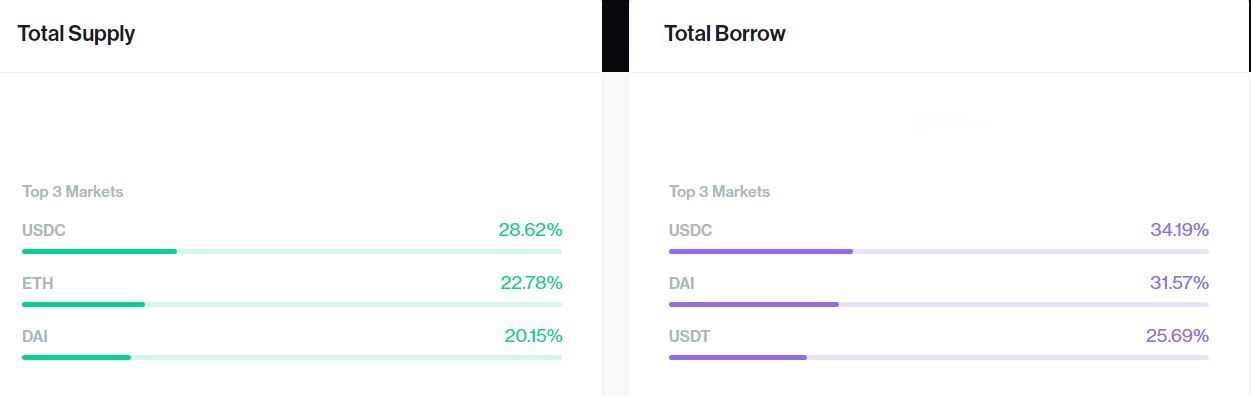 Чаще всего, по данным платформы, пользователи оформляют займы в USDC, DAI и USDT, под обеспечение USDC, ETH и DAI.