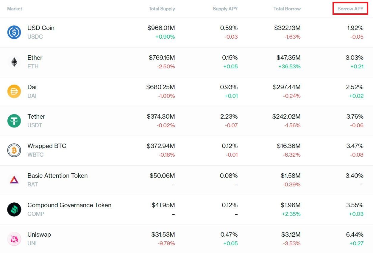 Процентные ставки в протоколе постоянно меняются. За их значение отвечают специальные алгоритмы, которые отслеживают показатели спроса и предложения на блокировку под обеспечение и оформления займа в том или ином активе.