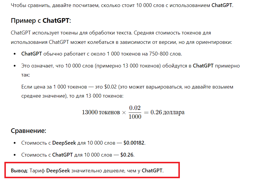 Дело в том, что DeepSeek оказался дешевле ChatGPT. На разработку и поддержание работы чатбота компания тратит меньше денег. Да и стоимость подписки у китайской нейронки ниже. Тарифы на ChatGPT указаны здесь, а на DeepSeek — здесь.
