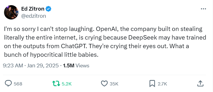 «Простите, я не могу перестать смеяться. OpenAI, компания, которая построена на фактической краже всего интернета, плачет, потому что DeepSeek, возможно, обучалась на выводах ChatGPT», — пишет журналист Эд Зитрон, напоминая о спорных методах обучения моделей самой OpenAI.