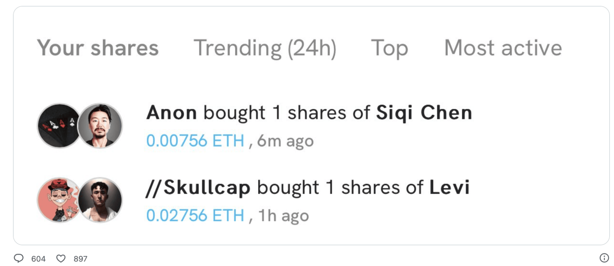В случае с Friend.tech цена одной акции в ETH находится в математической зависимости от количества купленных бумаг.