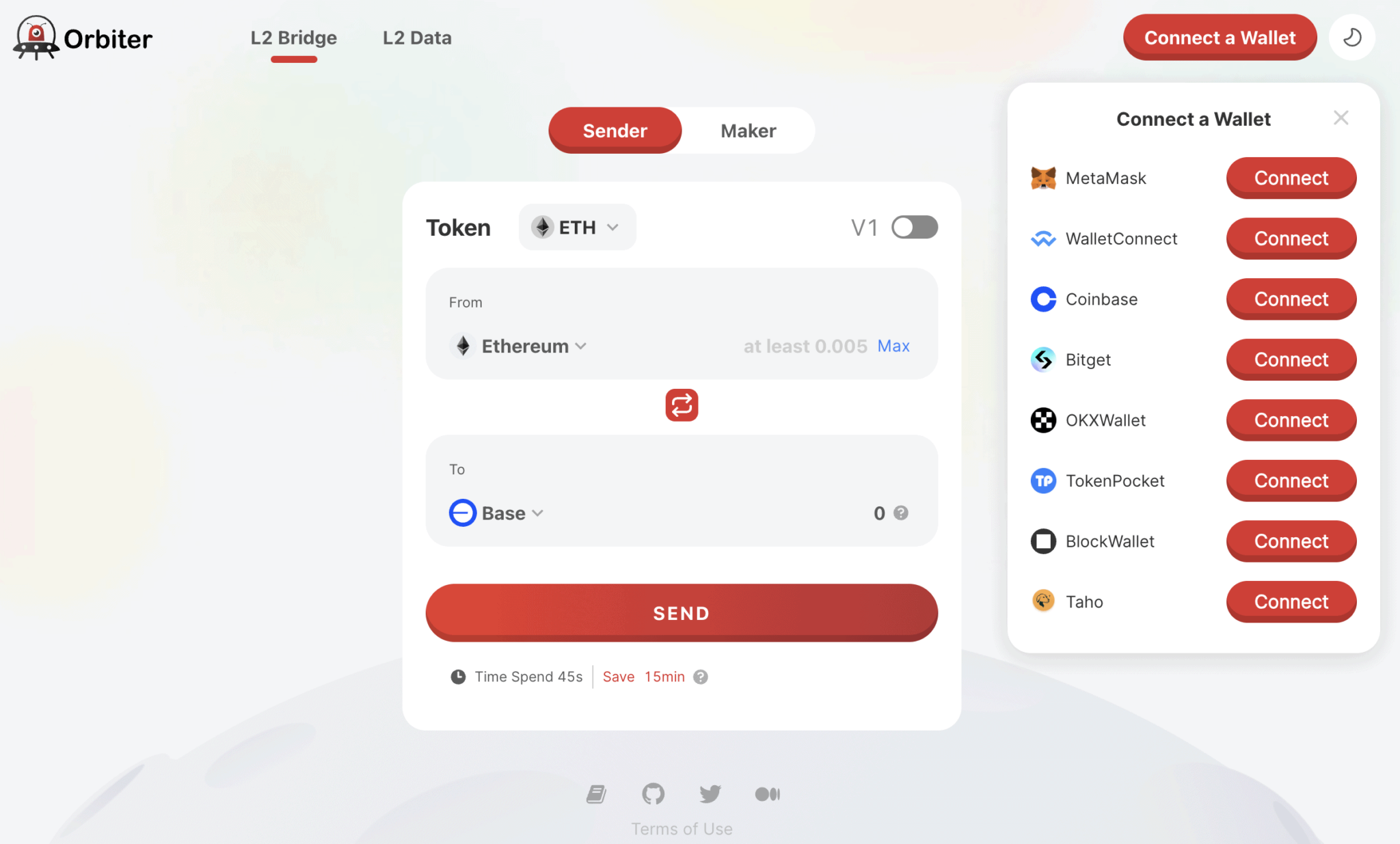 Для полноценного использования платформы нужно внести минимальный депозит в 0,01 ETH на адрес в сети Base. Сделать это можно с помощью моста Orbiter.Finance.