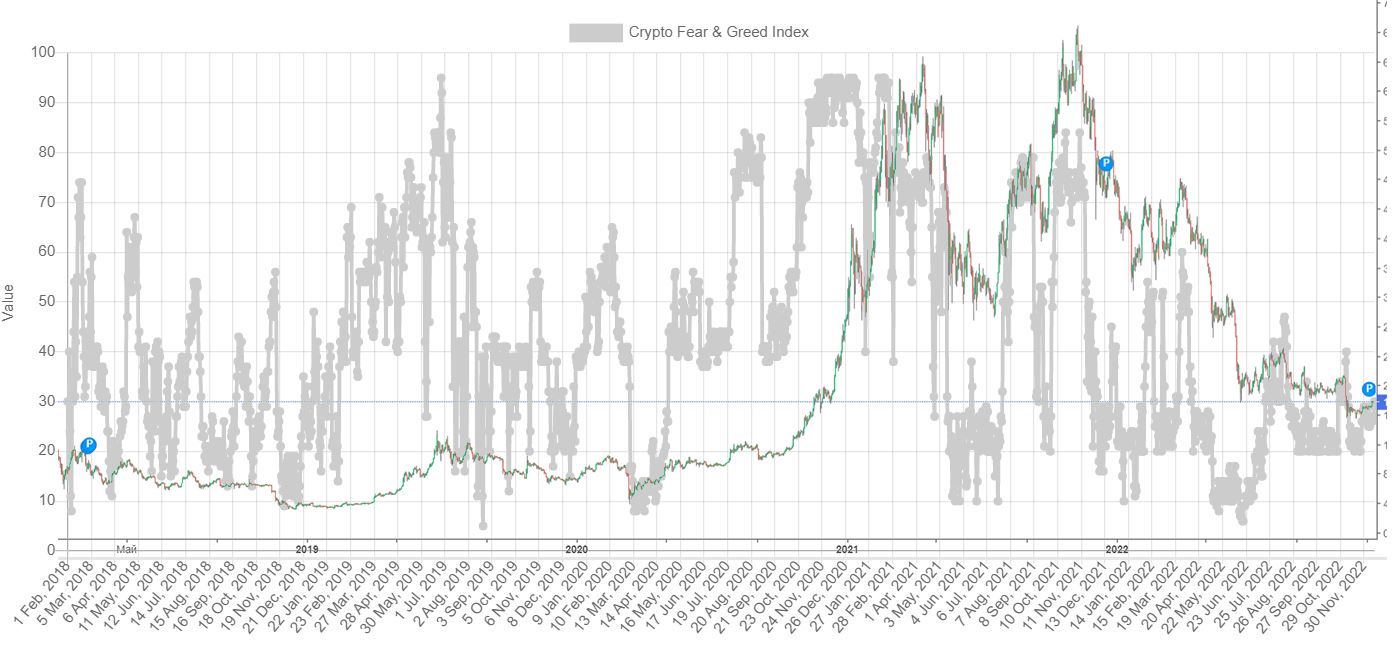 Увидеть, как работают сигналы индекса помогает его наложение на график биткоина. Пиковые значения BTC, как правило, приходятся на максимальную жадность, а минимумы – на экстремумы страха.
