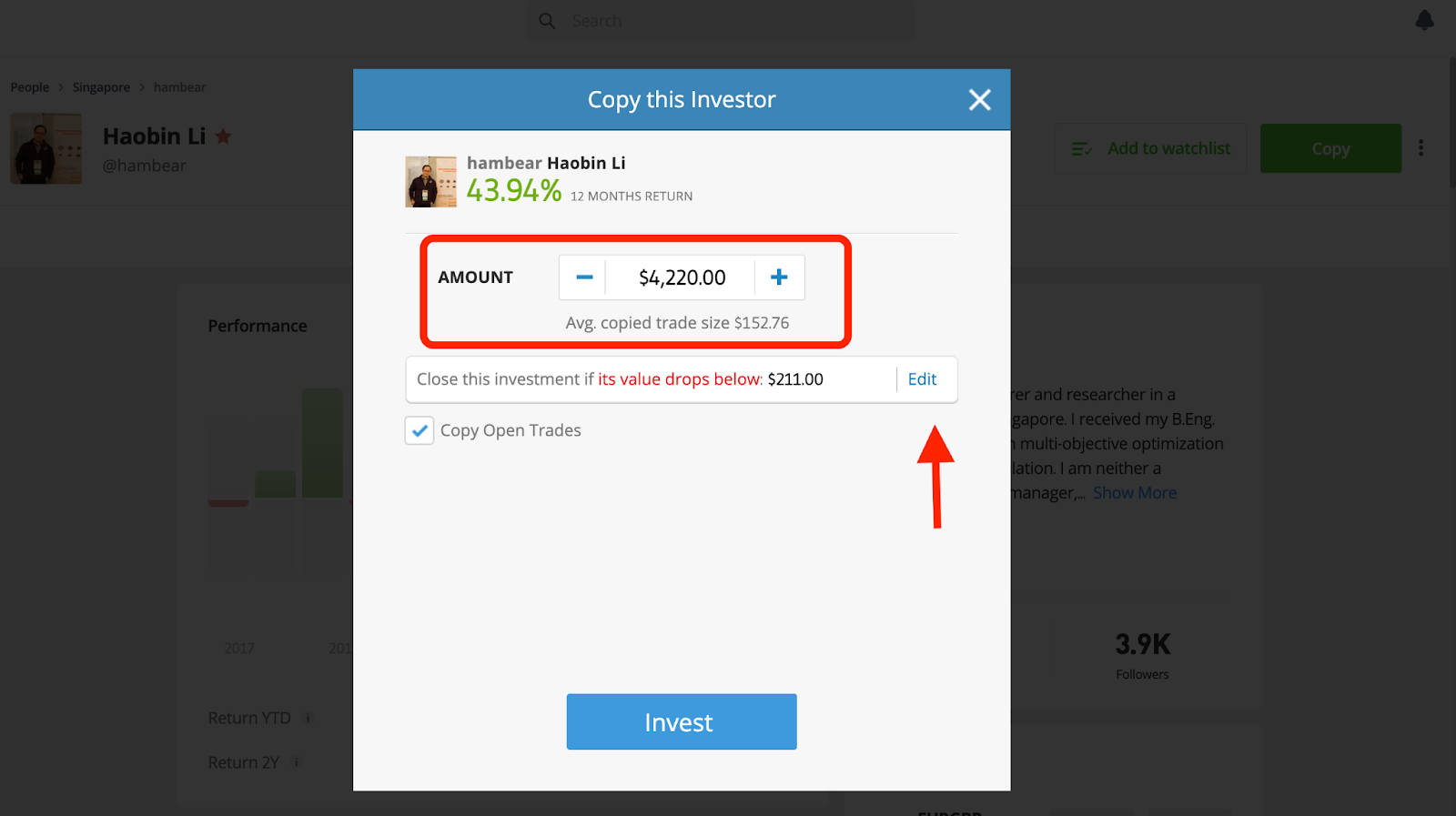 После выбора трейдера нужно перейти в его карточку и запустить копитрейдинг. Как правило, на этом этапе система просит определить объем активов для работы и задать другие настройки, например, выбрать уровень капитала для остановки повторения сделок.