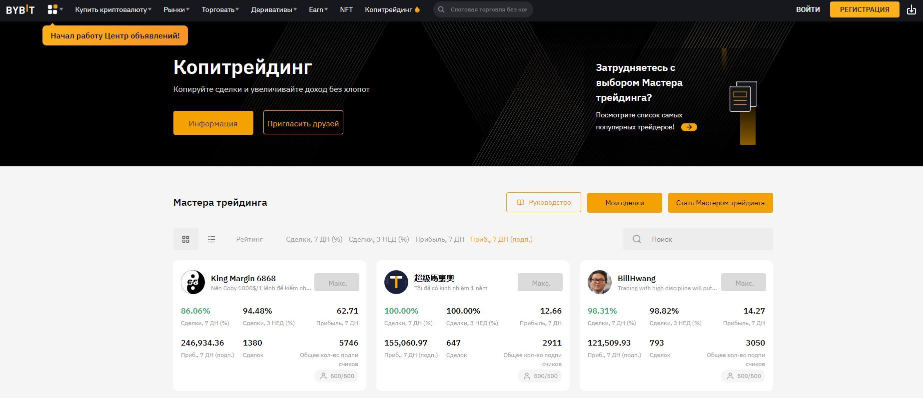 По состоянию на момент написания обзора Bybit – одна из самых полнофункциональных и быстроразвивающихся платформ на рынке цифровых активов. Площадка отличается простым интерфейсом и строгим отношением к проверке трейдеров, чьи операции смогут повторять другие пользователи.