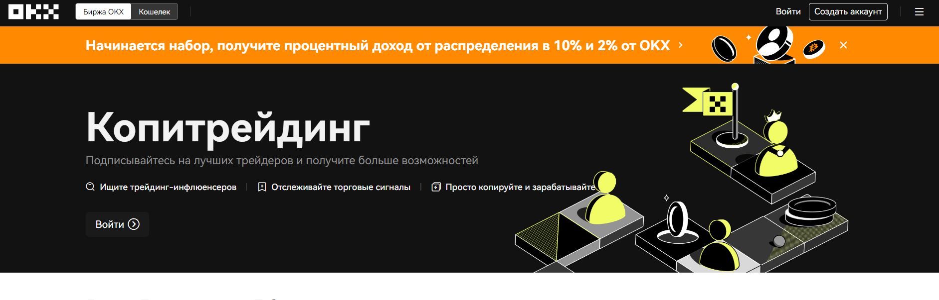 Криптобиржу OKX основали в 2017 году. С тех пор проект, который зарегистрировали на Сейшельских островах, завоевал мировое признание. По состоянию на момент написания обзора, OKX предлагает клиентам широкий выбор инструментов, среди которых, в том числе, есть сервис копитрейдинга.