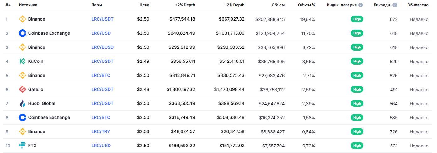 Монета представлена на многих популярных криптобиржах, включая Binance и Coinbase. На момент написания обзора топ-10 торговых пар с LRC по объему сделок выглядит следующим образом: