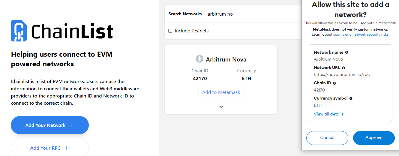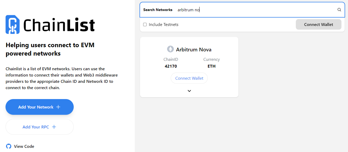 - Если вы хотите использовать Arbitrum Nova, то заметите, что ее нет в списке сетей. Чтобы добавить Nova в MetaMask, откройте в браузере сайт ChainList и найдите ее в поле поиска. ChainList содержит полный список сетей Ethereum Virtual Machine (EVM) и помогает пользователям добавлять их в кошельки MetaMask.