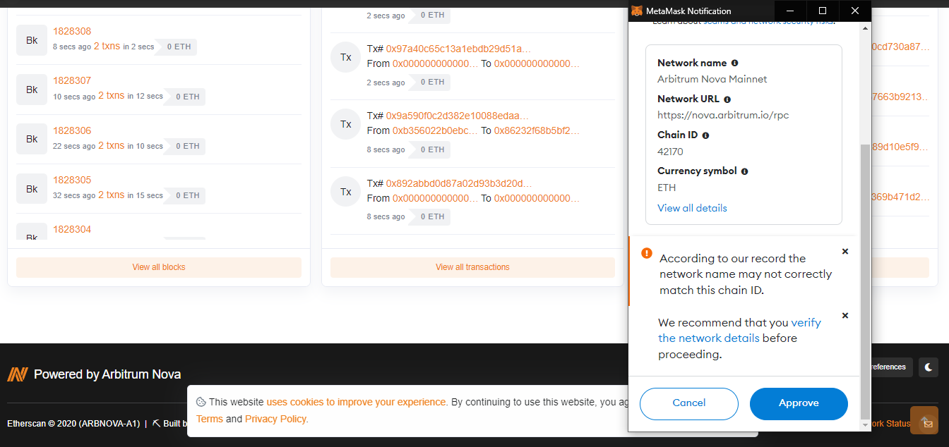 - Вы также можете добавить сеть с помощью Nova Arbiscan. Прокрутите страницу вниз, нажмите «Добавить сеть Arbitrum Nova» в правой части сайта и подтвердите действие.