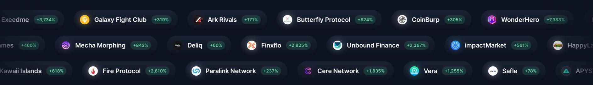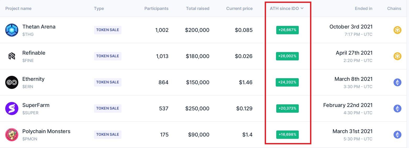 Попадание в белый лист гарантирует пользователю возможность закупиться токенами перспективного проекта по минимальной цене. В дальнейшем, на фоне развития платформы и листинга криптовалюты на крупных криптобиржах, курс монеты может существенно вырасти. Вот, например, на каком уровне зафиксированы максимумы токенов ряда проектов, которые провели IDO на Polkastarter:
