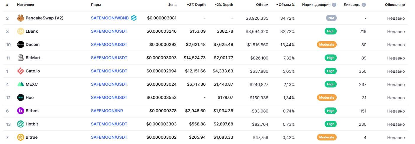 По состоянию на момент написания обзора, большая часть торгов с токенами проекта происходит на децентрализованной бирже PancakeSwap (V2). Топ-10 торговых платформ, в стенах которых можно купить SafeMoon, выглядят следующим образом: