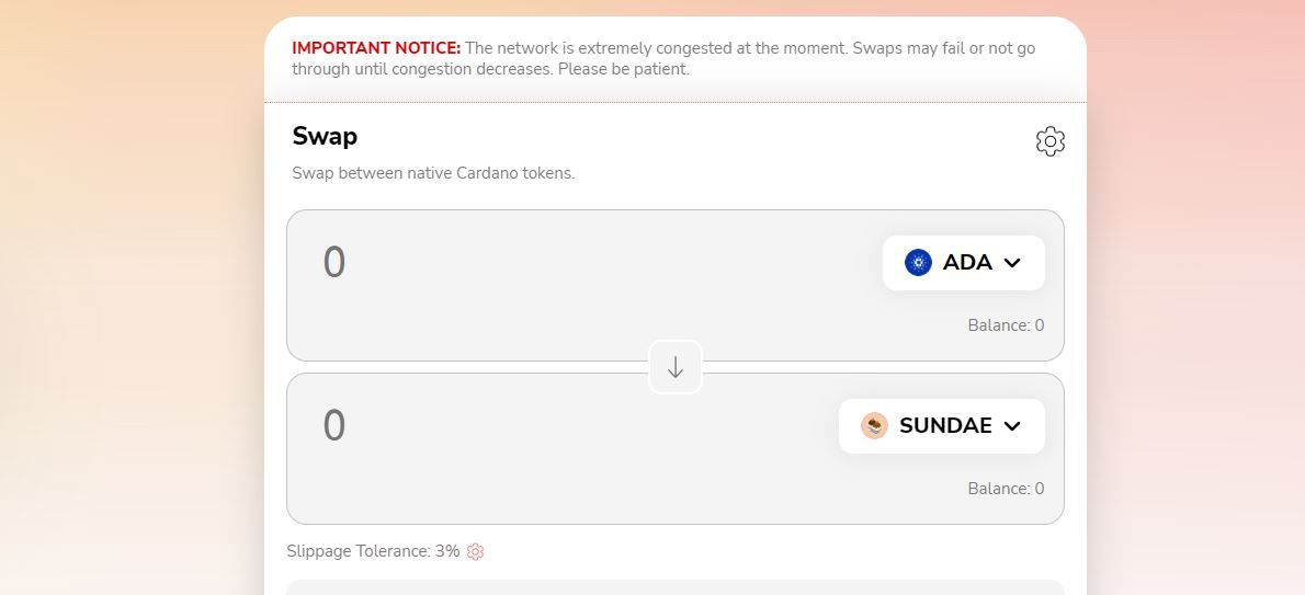Запуск SundaeSwap, после серии тестов, состоялся 20 января 2022 года. Старт оказался неудачным для криптобиржи. Практически сразу после выхода DEX в онлайн пользователи начали жаловаться на перегрузку сети и зависание транзакций. Вскоре разработчикам удалось решить проблему.