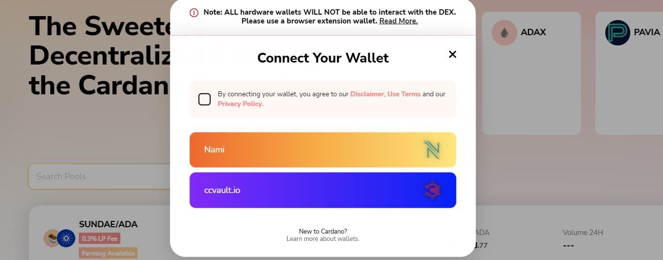 По состоянию на момент написания обзора, SundaeSwap предлагает инструменты для подключения только двух криптокошельков: Namiwallet и Ccvault.