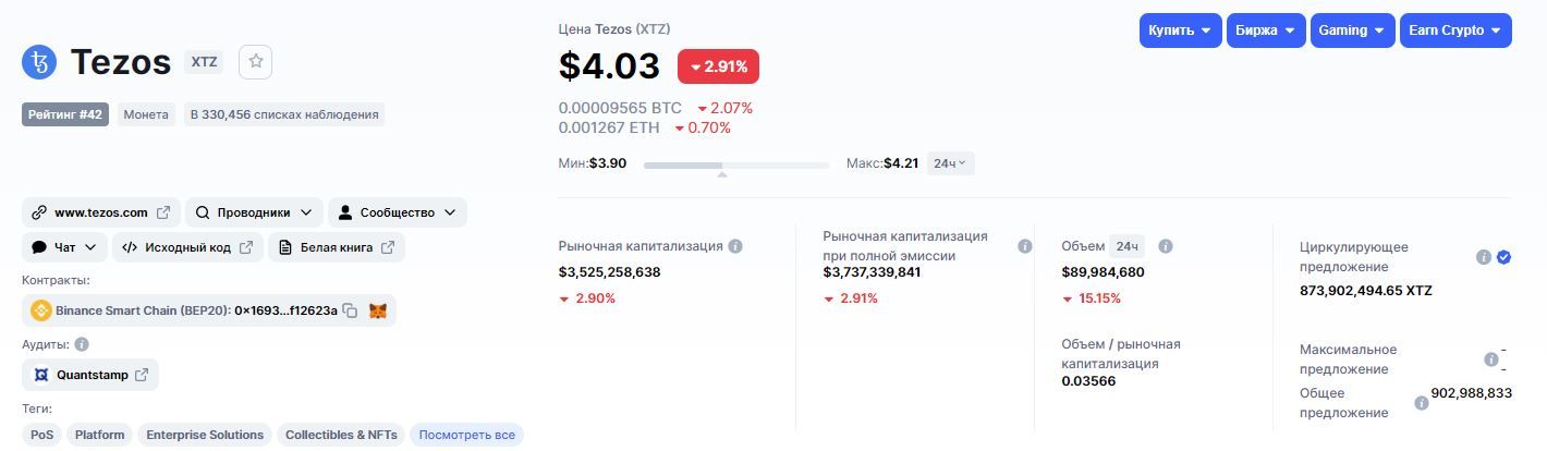 Криптовалюта Tezos в течение продолжительного периода времени входит в топ-100 капитализации. Максимум стоимости XTZ, по данным ресурса CoinMarketCap, зарегистрирован 17 декабря 2017 года на высоте $12.19. В период активного роста рынка цифровых активов 2021 года монете не удалось обновить пик.