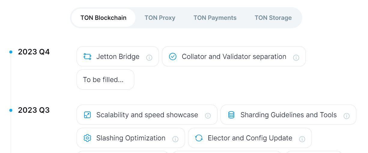 На сайте криптопроекта представлена дорожная карта, которая отражает уже реализованные задачи и планы разработчиков. В ней команда TON отдельно прописывает цели под развитие блокчейна, прокси-сервиса, раздела платежей и хранилища.