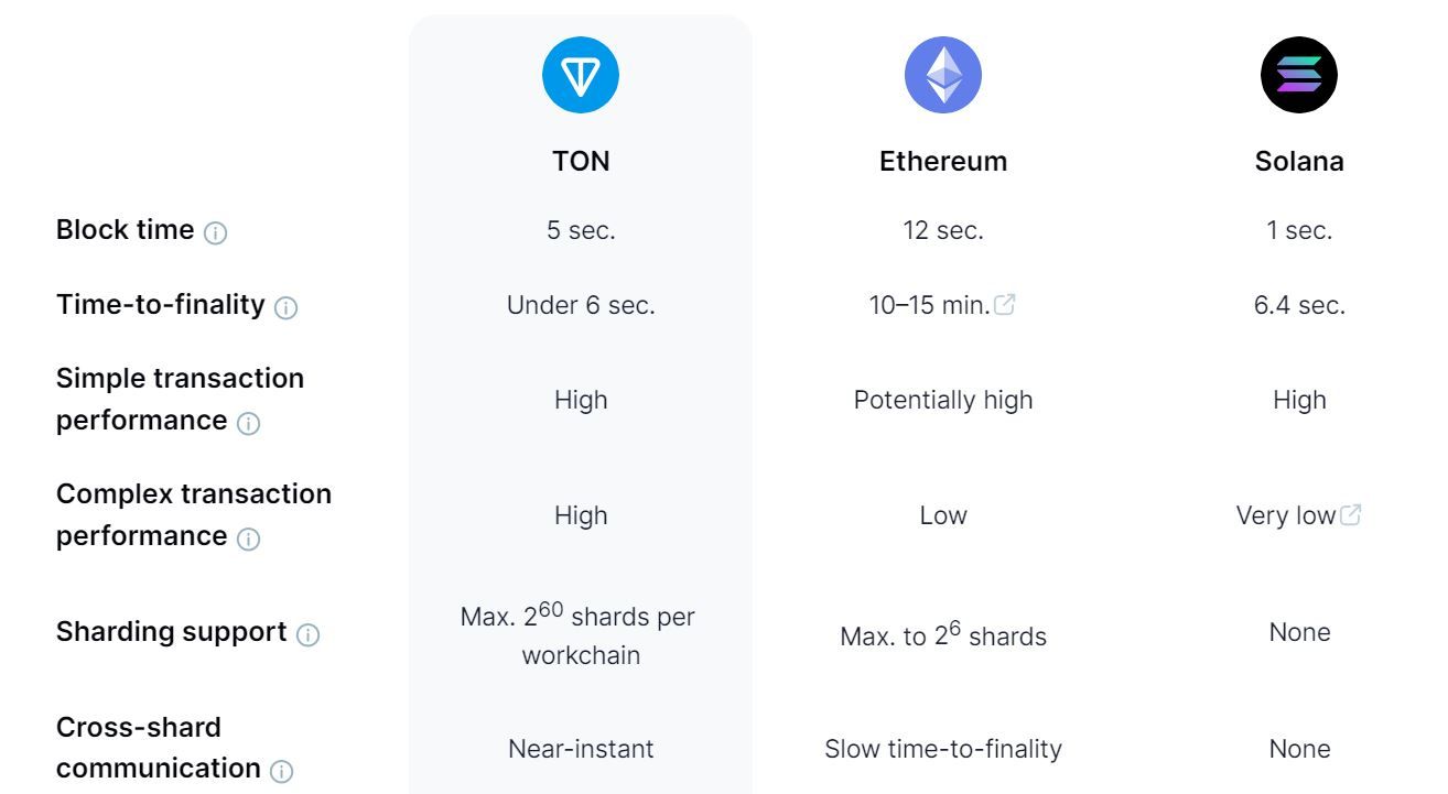 Чтобы продемонстрировать эффективность The Open Network, разработчики опубликовали сравнительную таблицу. Из нее следует, что TON обгоняет Ethereum по времени формирования блока (5 секунд против 12 секунд). Также The Open Network значительно обгоняет конкурентов по скорости обработки операций. Время до завершения транзакций в сети TON — до 6 секунд, тогда как у Ethereum — 10-15 минут, а у Solana — 6,4 секунды.