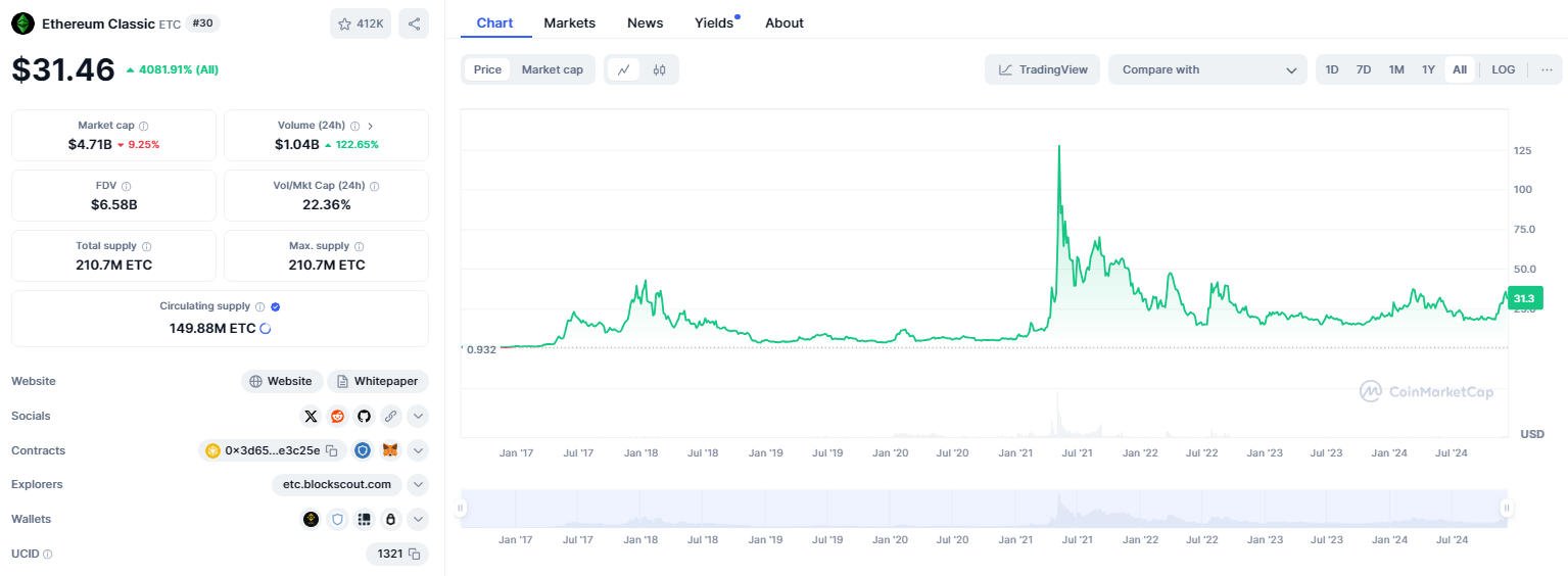 При этом Ethereum Classic (ETC), сохранивший оригинальный блокчейн, также имеет потенциал. По его мнению, долгосрочная аккумуляция открывает перед монетой возможность движения к диапазону $110–150, что означает рост в 4-5 раз от текущих уровней.