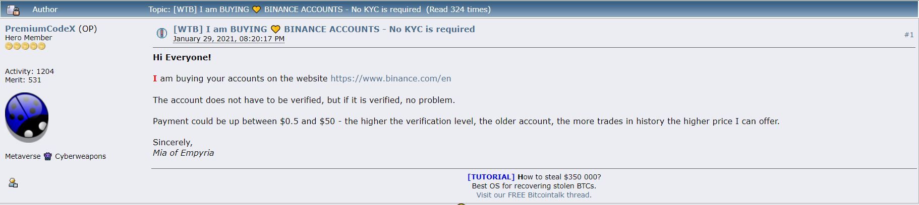 Также в сети можно найти предложения о скупке верифицированных аккаунтов криптобирж. Ниже — пример такого объявления. Продавец платит до $50 за аккаунт. Чем выше уровень верификации, чем старше учетная запись и чем больше в ее истории сделок — тем выше цена.