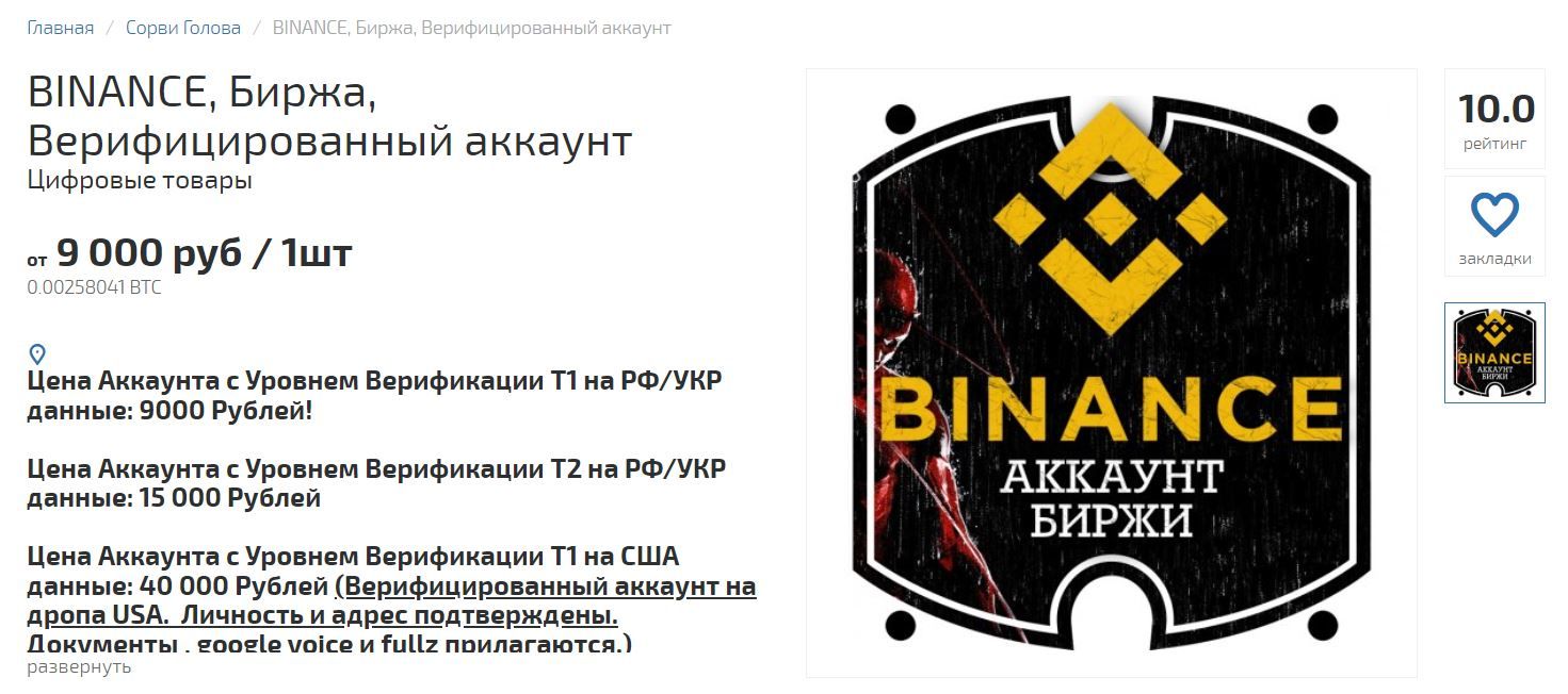 Чтобы выяснить порядок цен, редакция BeInCrypto ознакомилась с предложениями в даркнете. Стоимость верифицированных аккаунтов Binance стартует от 3500 рублей. Средний ценник — около 10 000 рублей. Стоимость зависит от ряда факторов, включая уровень верификации и гражданство пользователя, на которого зарегистрирована учетная запись.