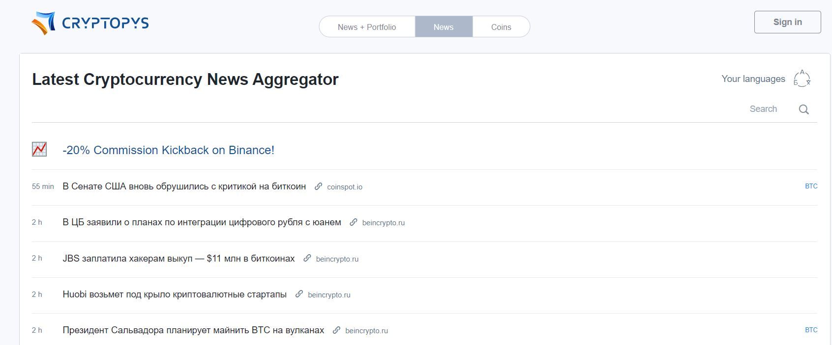 На агрегаторе CryptoPYS можно выбирать новости криптовалют по языку публикаций. Платформа отличается минималистичным дизайном. Для удобства поиска публикаций на площадке есть поле для ввода ключевых слов.