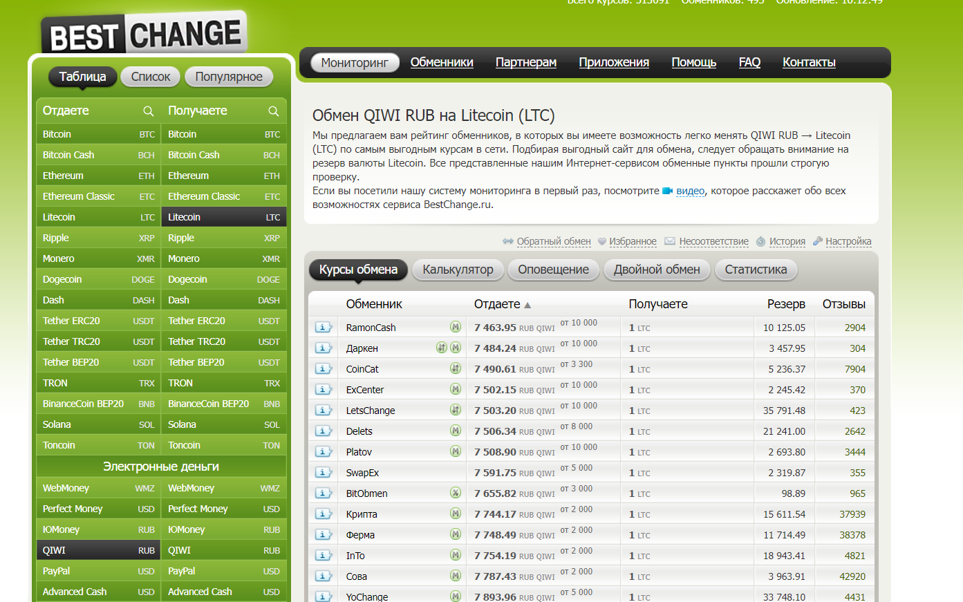 Подобрать обменник можно на агрегаторе BestChange. Для этого потребуется указать способ оплаты и монету. Система подберет доступные варианты. Перед выбором обменника и проведением операции ознакомьтесь с отзывами о платформе. Спросить совет можно, например, в Телеграм-сообществе BeInCrypto.