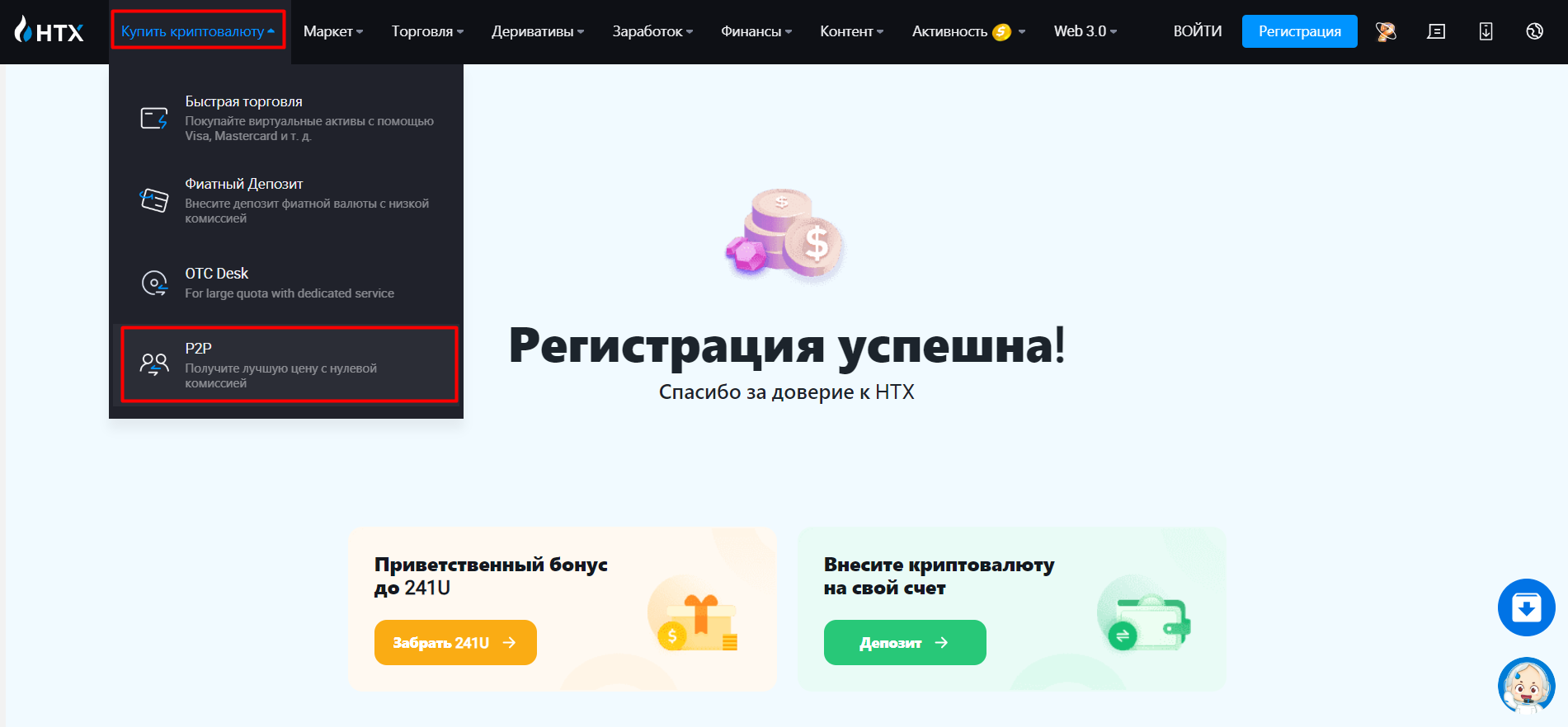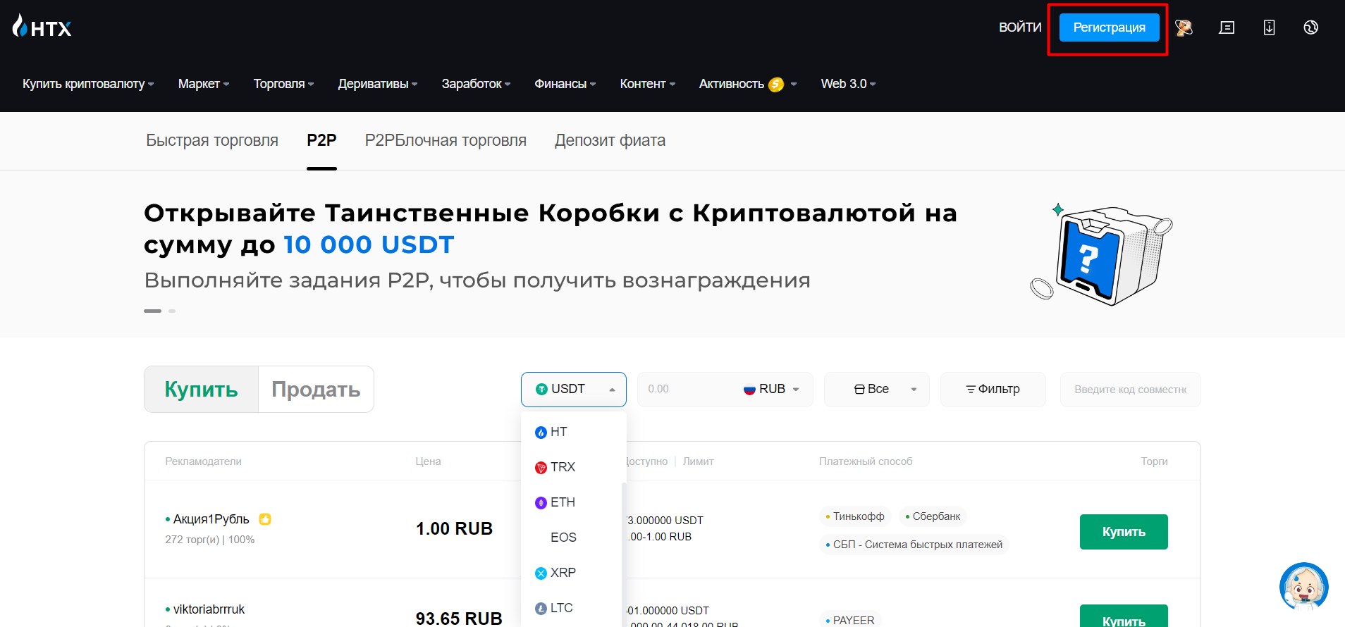 Третий шаг. Покупка. Теперь, когда вы прошли второй уровень верификации, можно отправиться на P2P-платформу Huobi. Она находится в разделе «купить криптовалюту».
