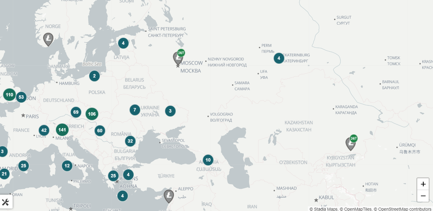 Альтернатива — зарегистрировать кошелек через криптобанкомат в процессе покупки криптовалюты. На момент написания обзора, карта ATM, которые поддерживают работу с Litecoin, в европейской части России, выглядит следующим образом: