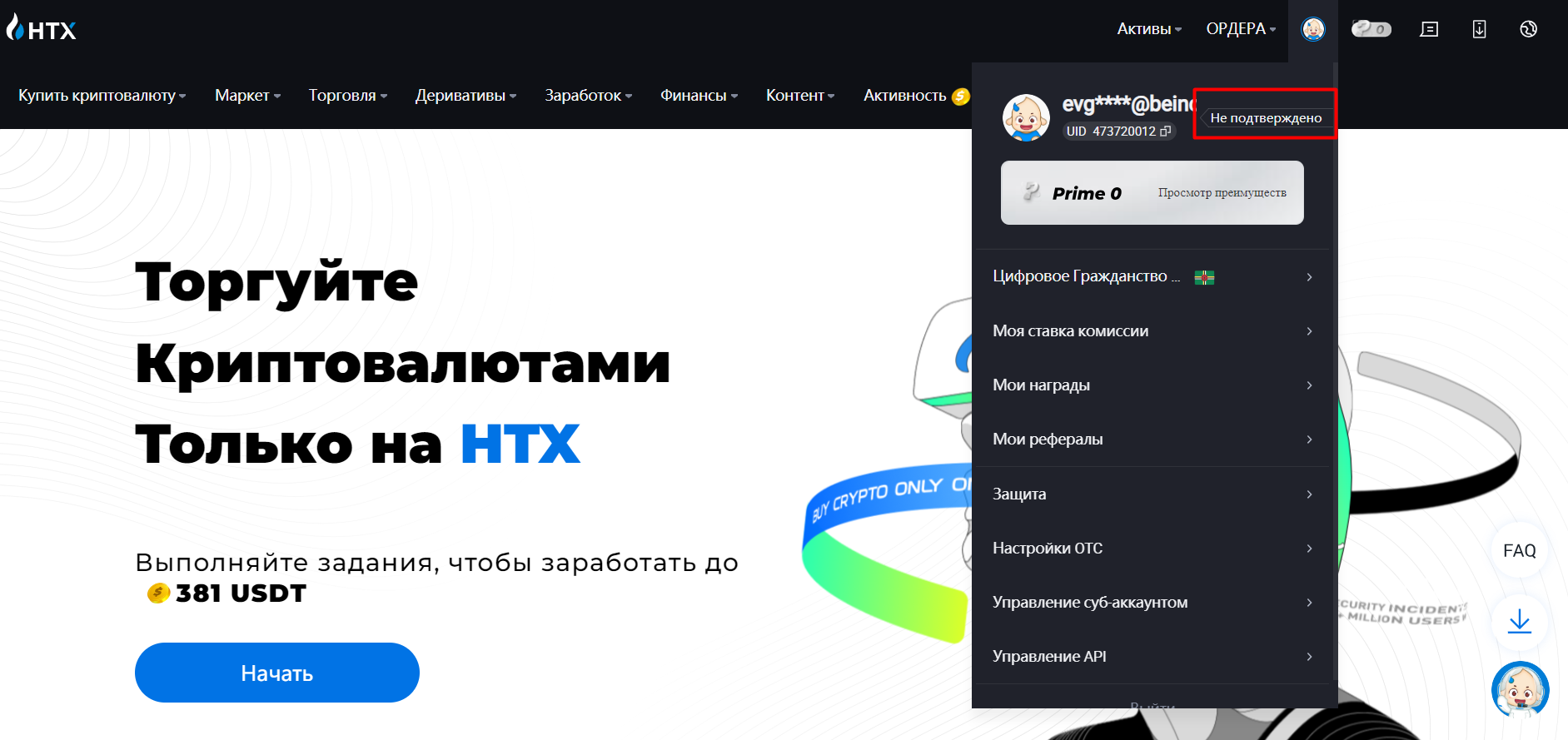 Второй шаг. Верификация. Без нее неполучится провести операцию на P2P. Чтобы верифицировать аккаунт, нажмите на его статус в кабинете.