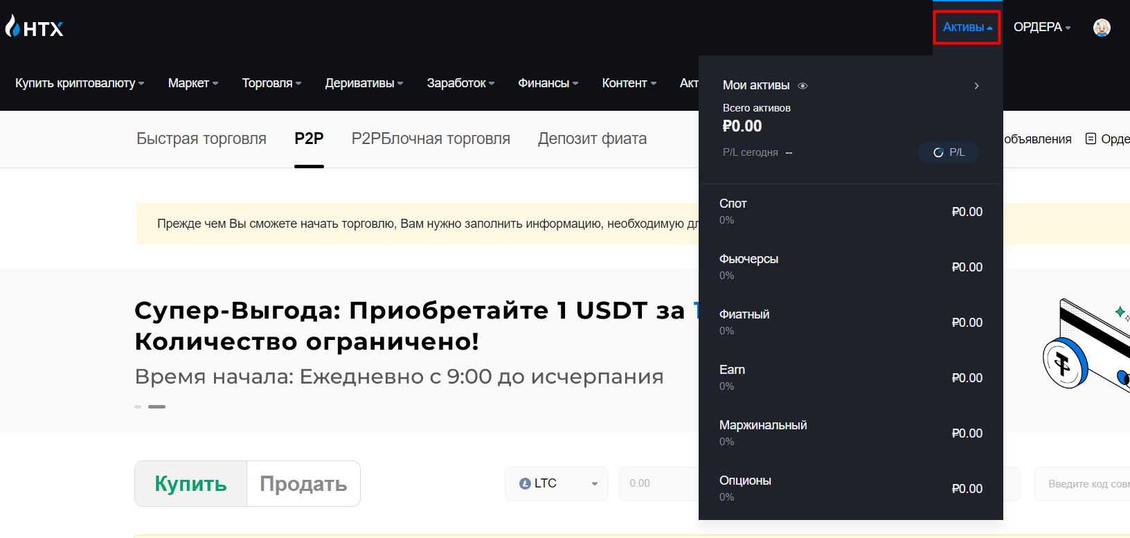 Рассмотрим, как купить Litecoin на бирже через P2P-платформу. Для этого возьмем Huobi. Это одна из старейших на рынке бирж. Также наш выбор пал на Huobi потому, что в стенах ее P2P-платформы можно купить Litecoin за рубли без комиссии. Другие криптобиржи предлагают сначала купить другую монету, например, стейблкоин USDT, чтобы после обменять ее на LTC. Вариант Huobi — самый простой.