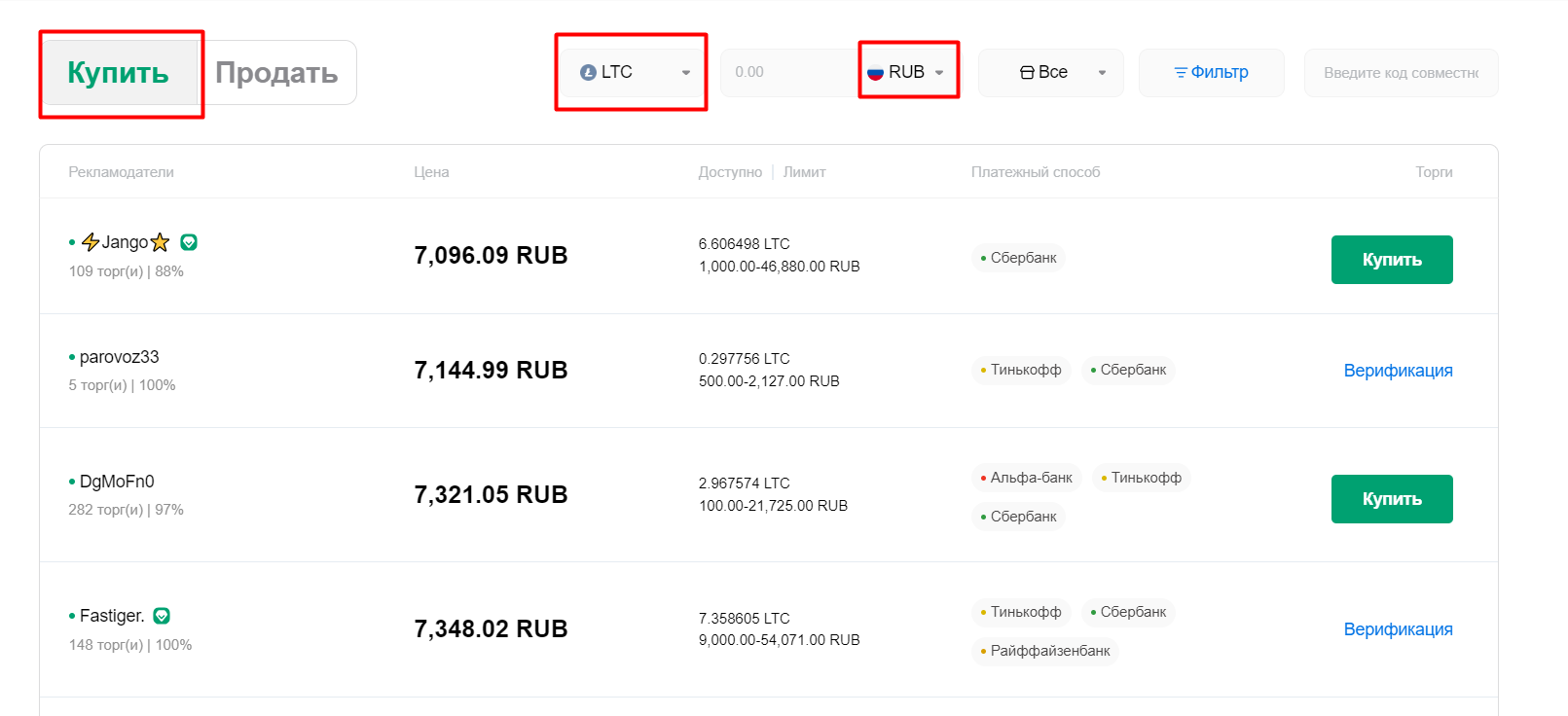 Чтобы отсеять ненужные предложения, установите настройки. В том числе, нужно выбрать криптовалюту, в нашем случае — Litecoin и валюту оплаты. В разделе «фильтр» можно указать предпочитаемый способ расчета. Huobi — одна из немногих криптобирж, которая не стала прятать подсанкционные российские банки. Поэтому в стенах ее P2P-платформы купить Litecoin можно по картам таких популярных кредитных организаций, как Сбер и Тинькофф.