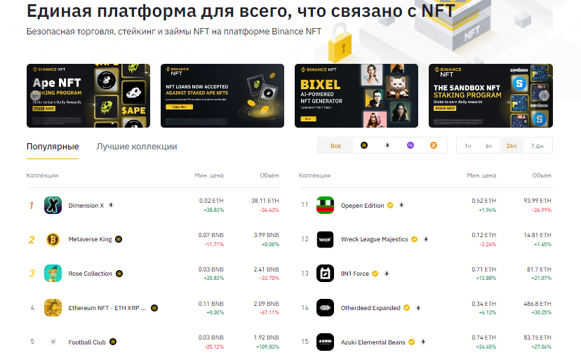 Binance – крупнейшая на рынке криптобиржа, которой доверяют многие участники криптосообщества. Торговая платформа предлагает пользователям массу инструментов и вервисов, включая NFT-маркетплейс.