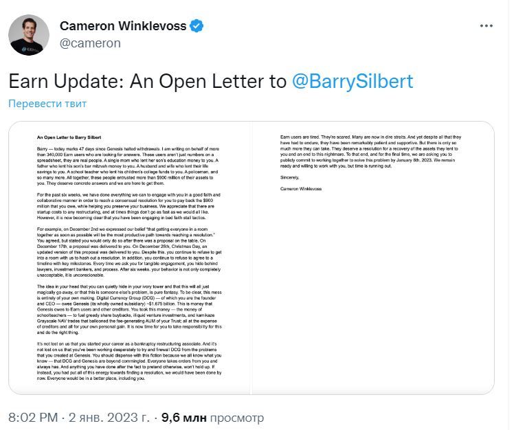 В открытом письме Кэмерон Уинклвосс призвал главу DCG решить проблему с возвратом денег к 8 января 2023 года.