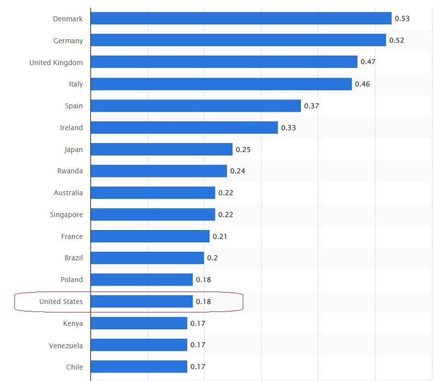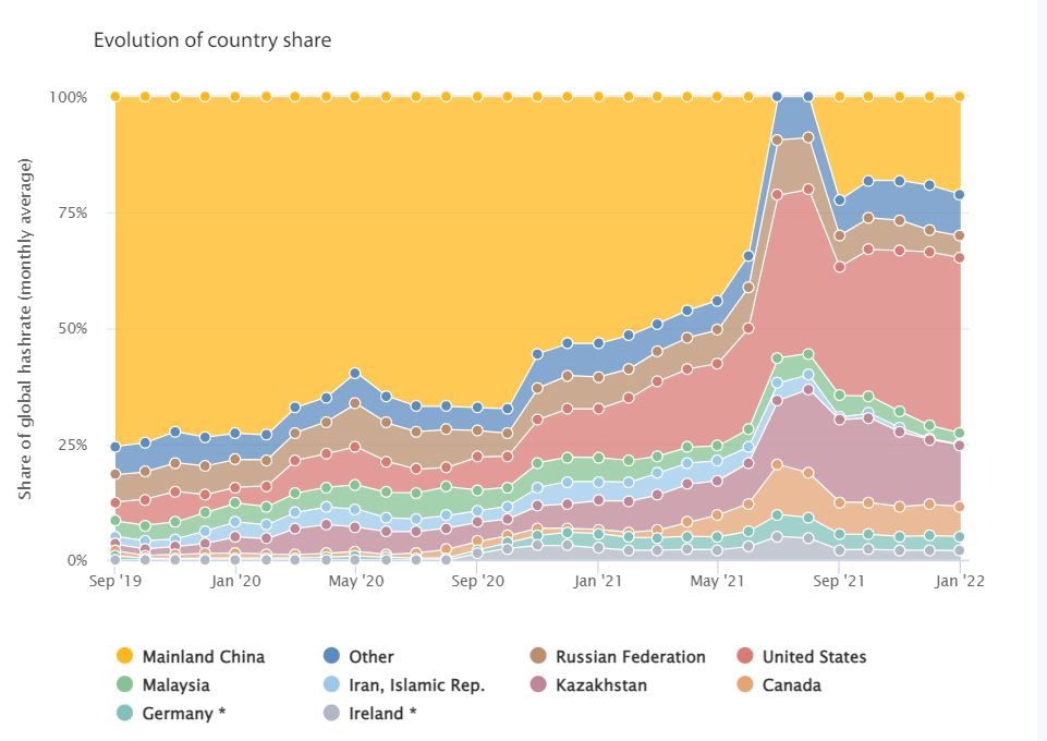 По данным аналитиков Кембриджского университета, по состоянию на начало 2022 года, на США приходилось 37,4% рынка майнинга биткоинов.