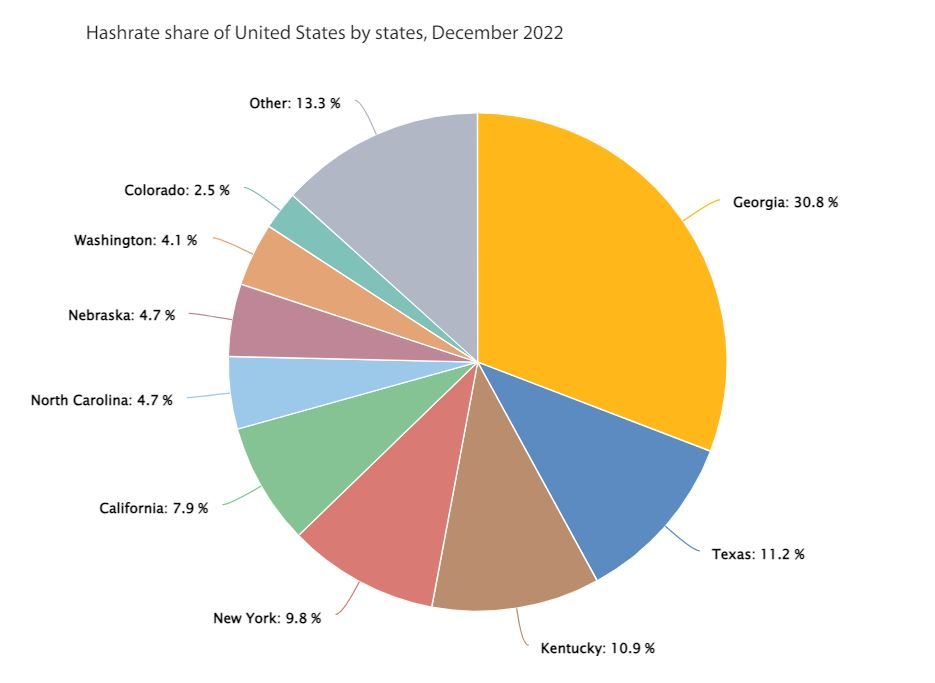 Статистика распределения хешрейта биткоина по штатам США свежее — последнее обновление датировано декабрем 2022 года. По данным аналитиков, больше всего майнеров BTC — 30% — работает в Джорджии. На втором месте — Техас (11,2%), за ним — Кентуки (10,9%).