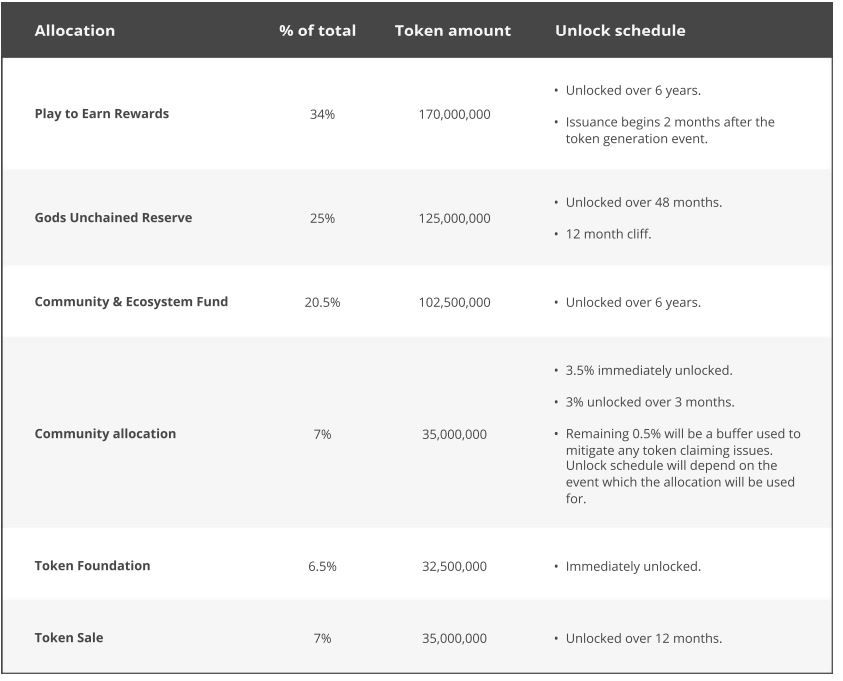 У игры есть нативный токен стандарта ERC-20 – Gods Unchained (GODS). Эмиссия криптовалюты ограничена. Всего будет выпущено 500 000 000 токенов. При помощи GODS платформа награждает игроков за их победы. Также токены служат единицей расчета, за которую, например, можно покупать карты.