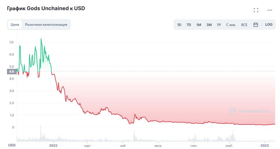 GODS, как и большинство других криптовалют, активно падала на фоне криптозимы после обновления биткоином абсолютного максимума в ноябре 2021 года.