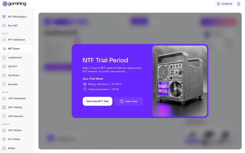 GoMining делает специальное предложение всем новичкам и тем, кто ранее не владел ни одним NFT — дарит семидневную пробную версию NFT. Этот пробный NFT представлен на странице NFT Game, его мощность добычи составляет 16 TH/s, а коэффициент энергоэффективности в 35 W/TH.