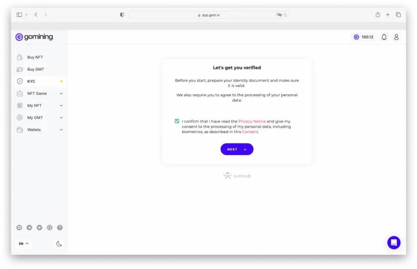 2. Перейдите к пункту KYC и нажмите кнопку «Согласен» на следующем экране.