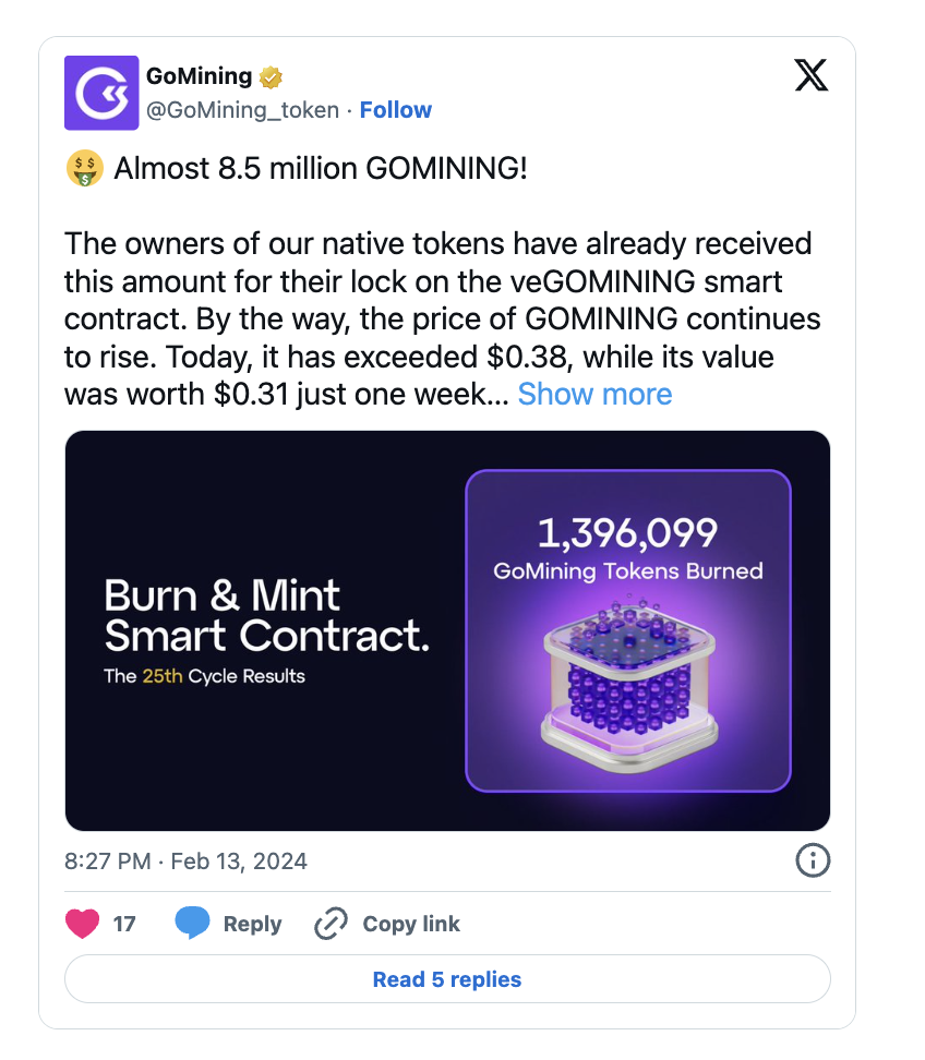 Кроме того, можно зарабатывать на стейкинге токенов GOMINING. В этом случае они конвертируются veGOMINING. Держатели veGOMINING получают выплаты из части вновь созданных токенов: им достается 20% всех вновь созданных токенов.