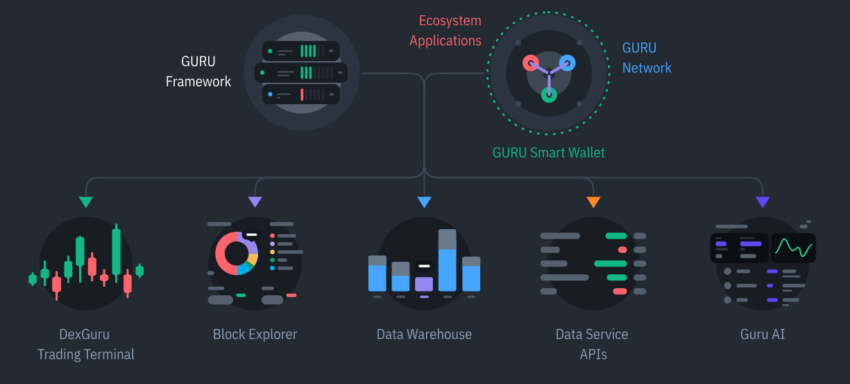 Этот масштабный проект изначально был запущен как децентрализованная биржа (торговый терминал DEXGuru), а затем превратился в универсальную платформу (Guru Network), которая объединяет реальные бизнес-процессы с ИИ и блокчейном. В 2024 году платформа берет на себя главную роль в том, чтобы упростить разработку и развертывание приложений, ориентированных на ИИ.