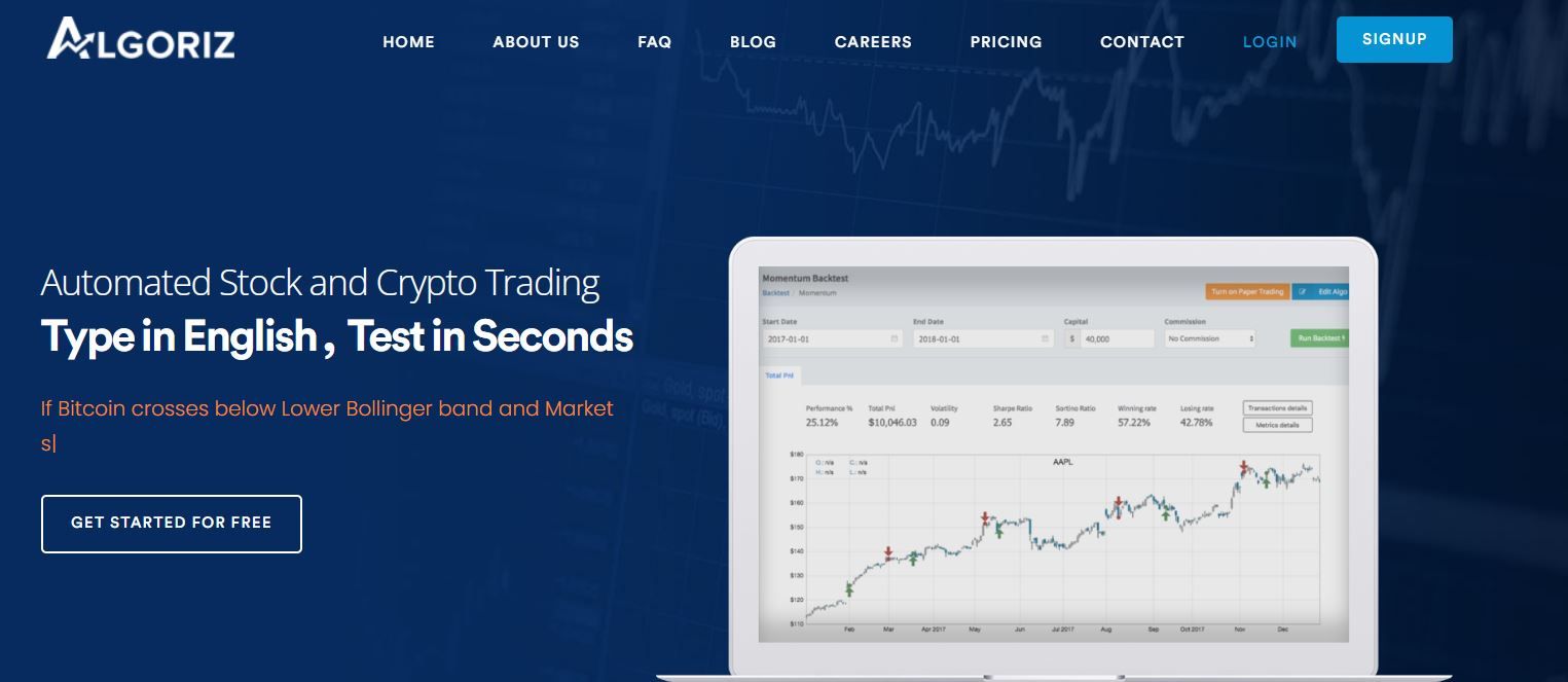 Algoriz — это торговый бот для автоматизированной торговли криптовалютой и акциями. Проект создан выходцами из Goldman Sachs и Millennium.