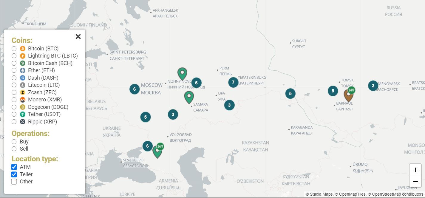 В Москве, согласно данным ресурса, установлено 6 криптобанкоматов. В Екатеринбурге – 7, в Новосибирске – 4. Во многих других городах также можно найти криптобанкоматы.