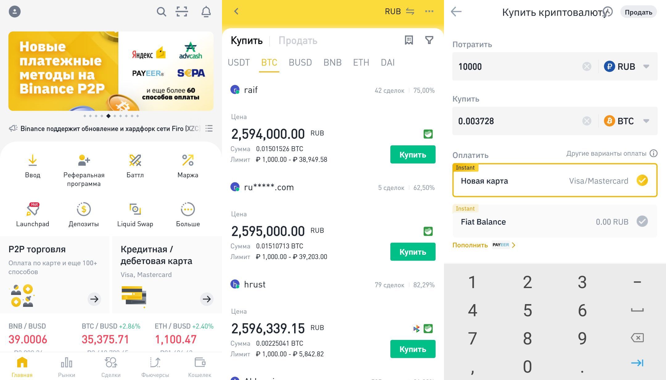 - На Binance можно найти много способов купить биткоин за рубли. Например, с карт, или напрямую у других пользователей платформы, через ее P2P-сервис.