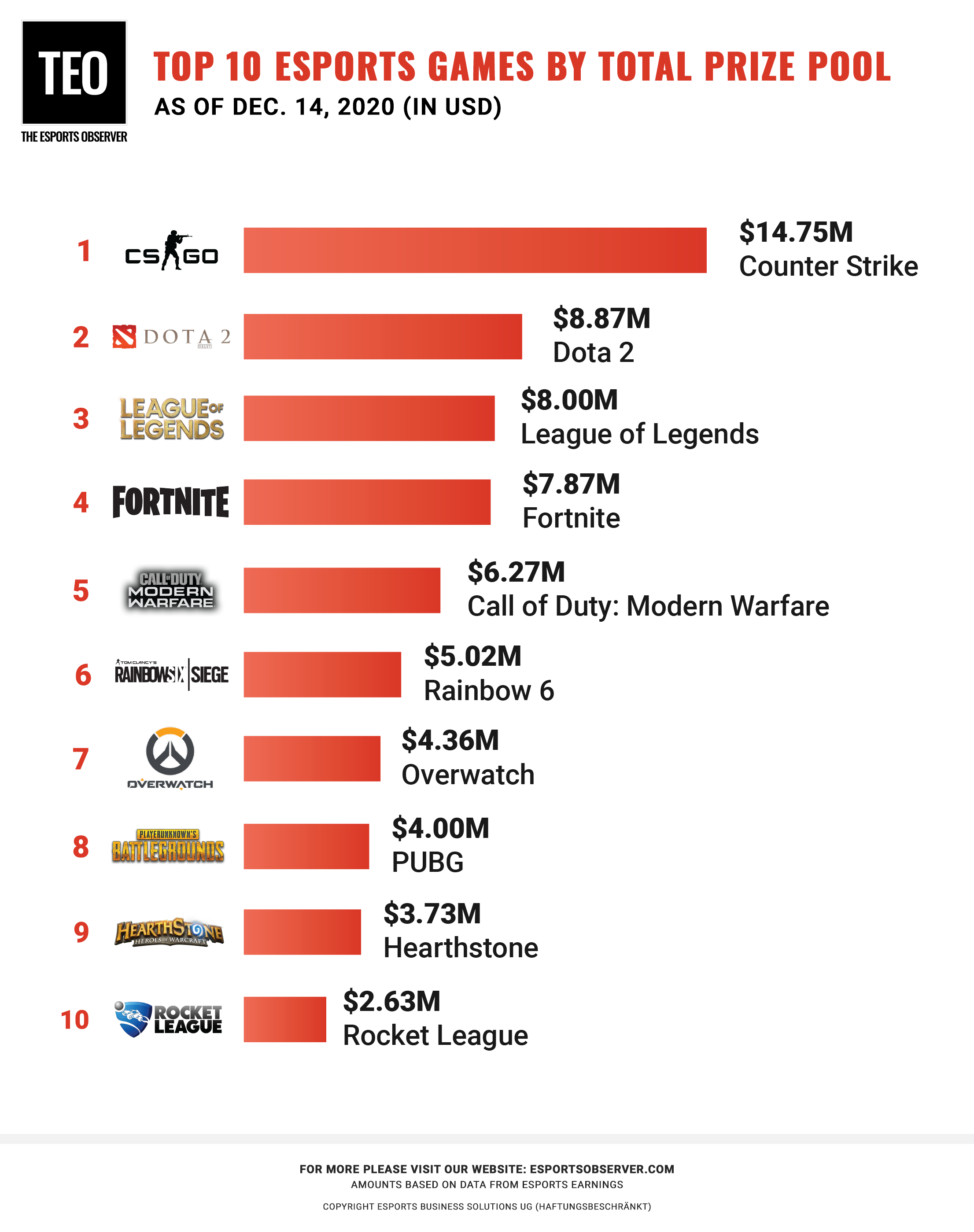 В начале 2021 года компания The Esports Observer составила рейтинг игр 2020 года по объему средств, разыгранных в турнирах: