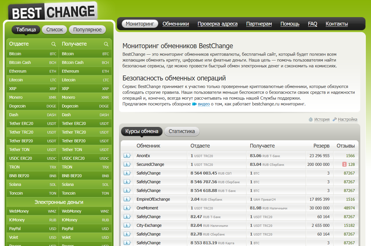На рынке множество криптообменников. Найти подходящий можно, например, при помощи агрегатора BestChange. При выборе тщательно изучите отзывы.