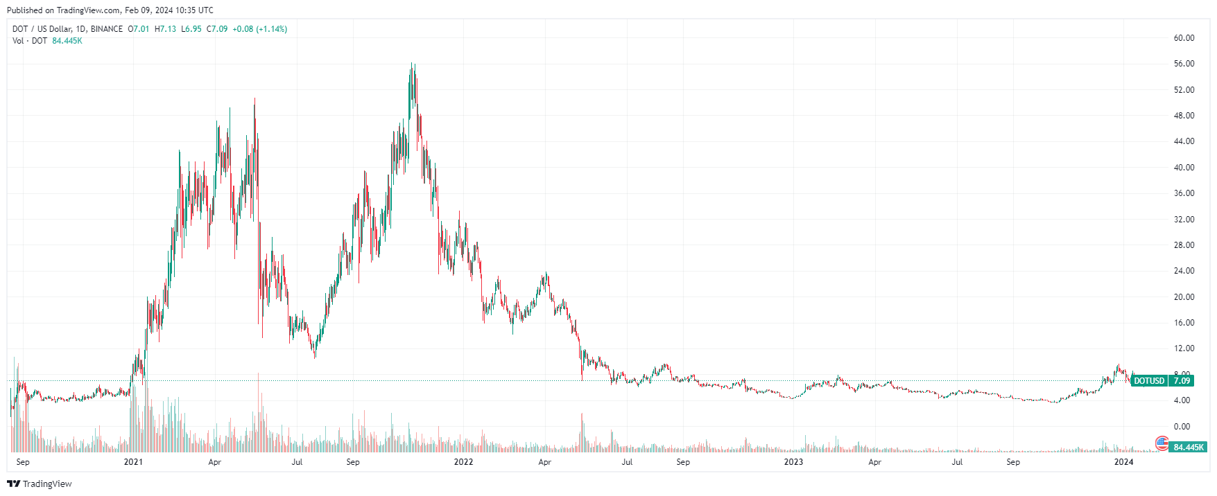 Максимум стоимости DOT, по данным ресурса CoinMarketCap, зафиксирован 4 ноября 2021 года на высоте $55.
