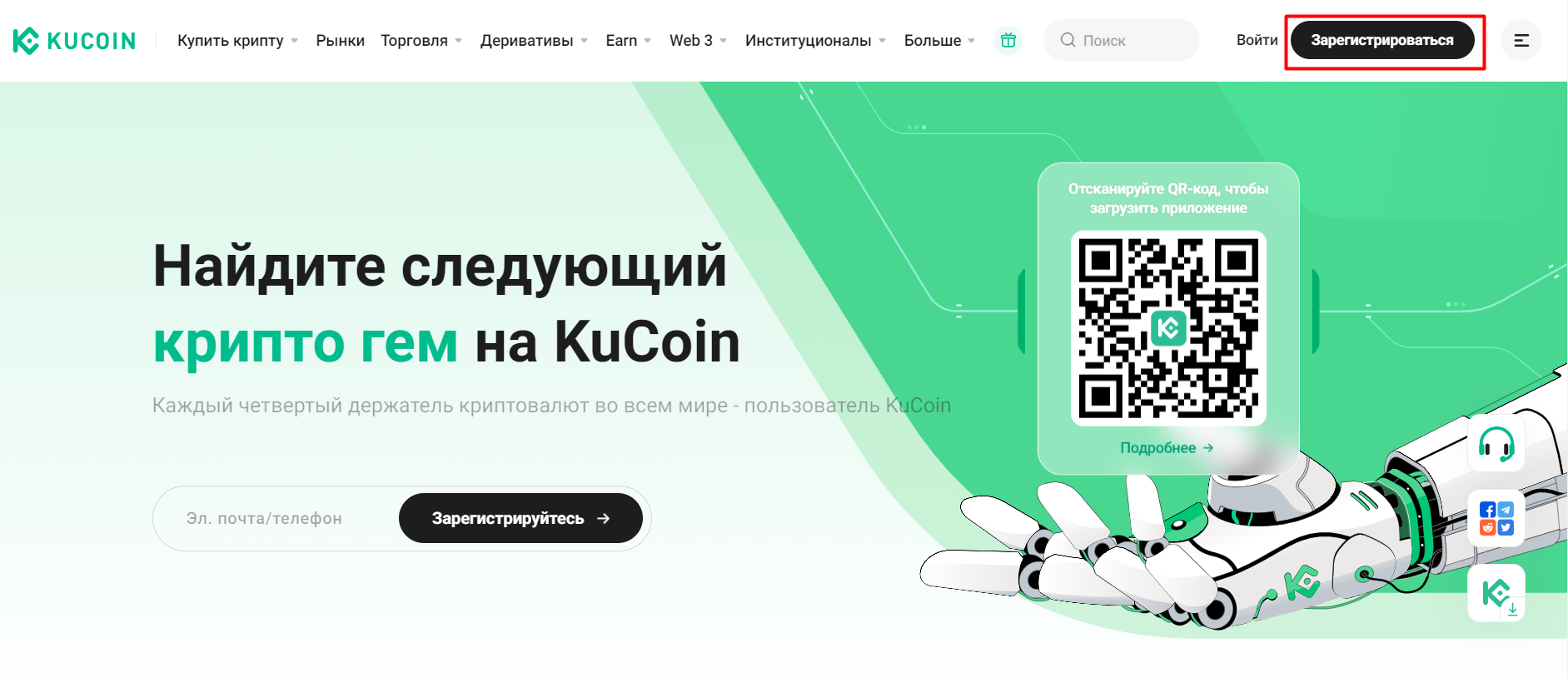 Перейдите на сайт KuCoin по ссылке и нажмите на клавишу «зарегистрироваться» в правом верхнем углу.